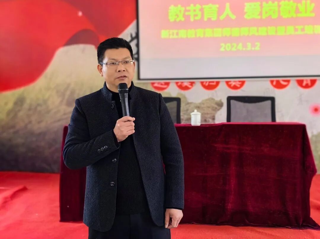 接着,执行校长肖承理为学校全体教职工做以“永远不要在工作上消耗自己”为题的培训。肖校长从“自我消耗、自我修炼和自我调适”三个方面强调如何成为一名恪守尽职的好员工、一名受人尊敬的好老师。强调全体教师要大力弘扬教育家精神,增强教书育人的责任感与使命感,做人民满意的好老师;要把对教育事业的热忱与情怀,内化于心、外化于行,做一名坚守职业道德的好教师,这是承诺的印证,是沉甸甸的责任。
