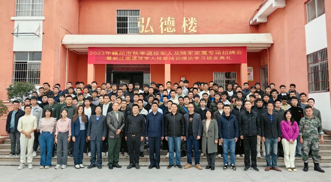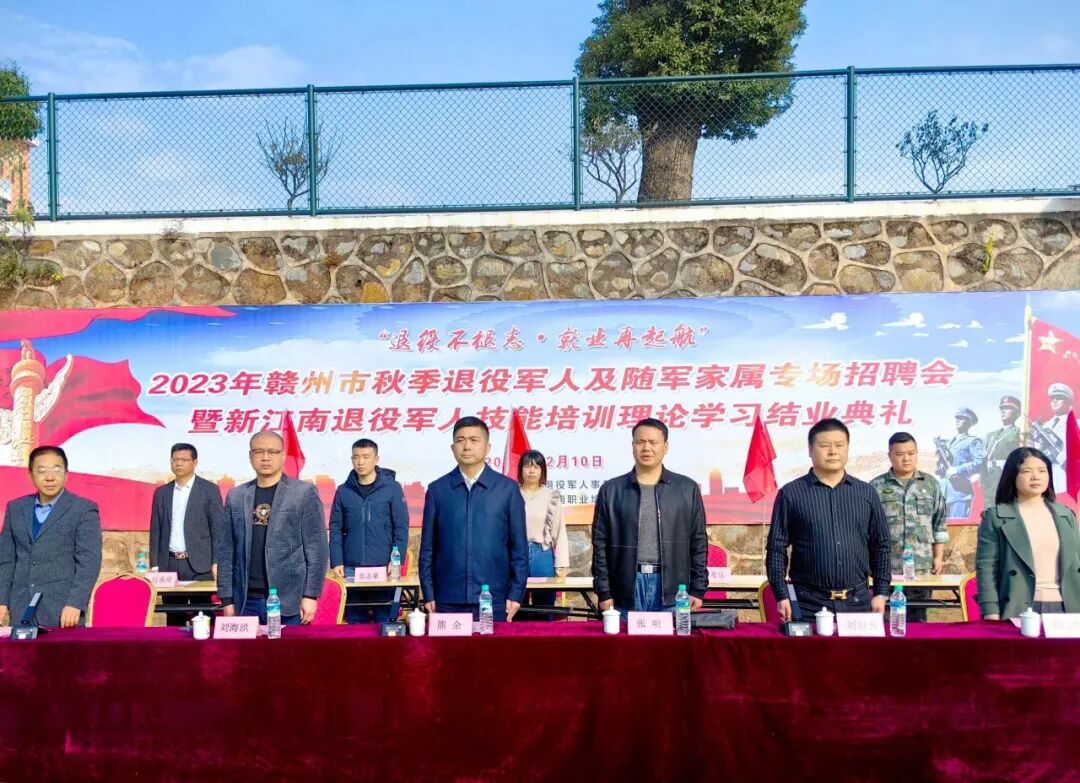 12月10日上午,2023年赣州市秋季退役军人及随军家属专场招聘会暨新江南退役军人技能培训理论学习结业典礼顺利举行。赣州市退役军人事务局党组织成员、副局长熊余、赣州市退役军人事务局安置科张明科长、章贡区退役军人事务局党组成员刘海洪副局长等领导和新江南教育集团董事长刘世芳、执行校长肖承理、副校长熊汉文等学校领导及相关负责人出席活动。结业典礼由副校长熊汉文主持。