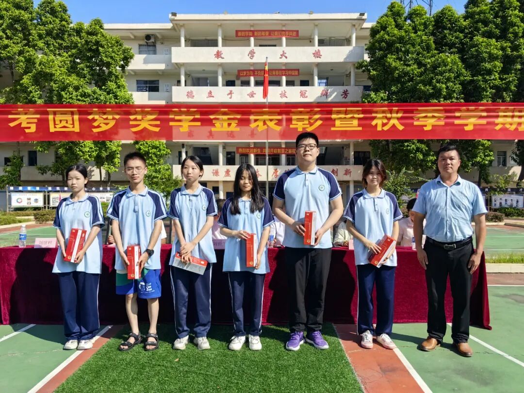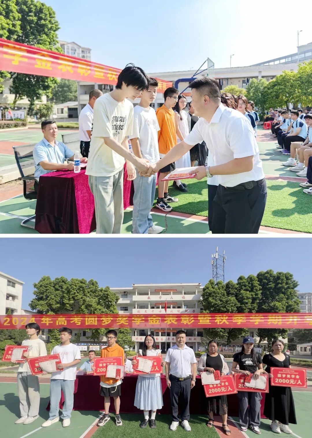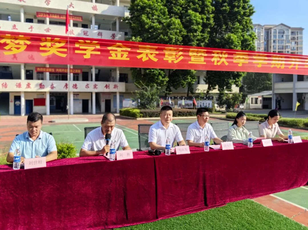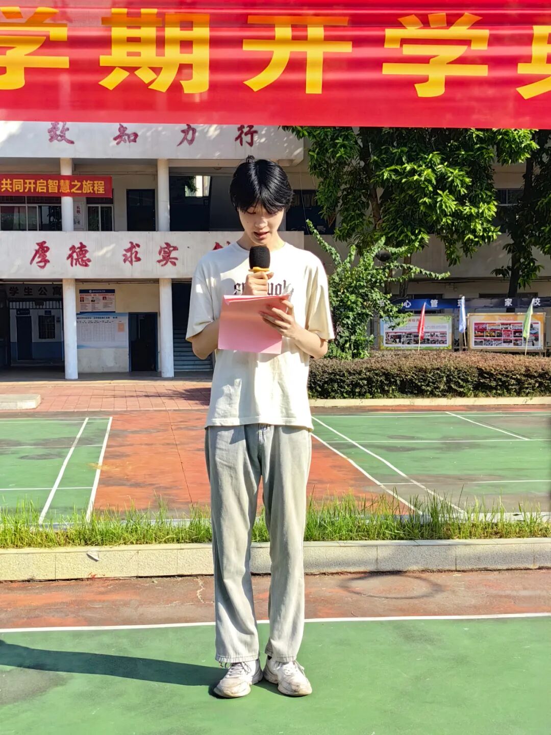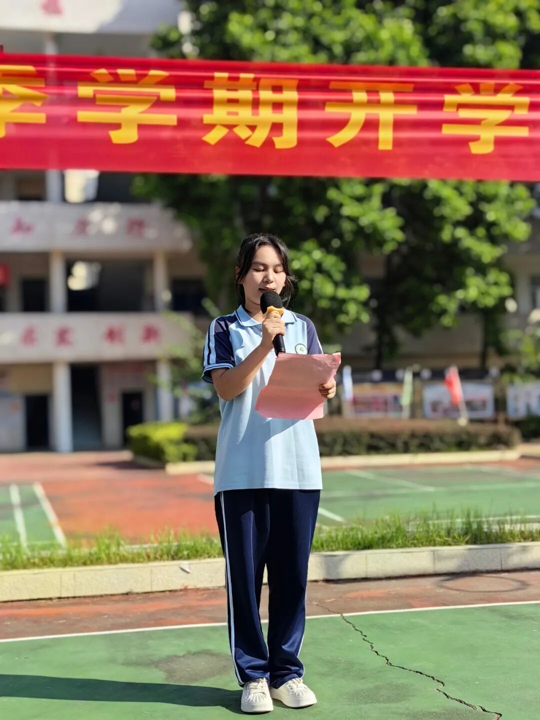 第一篇章:奏国歌,升国旗 上午8时,开学典礼在雄壮的国歌声中正式拉开帷幕,全体师生,面向国旗,行注目礼。 第二篇章:刘世芳董事长开学致辞 新学期,新希望。刘世芳董事长的致辞热情洋溢,令人振奋,为我们提出了宏伟的目标,描绘了宏伟的蓝图,吹响了冲锋的号角。他寄语莘莘学子:珍惜韶华,奋斗青春,要充分利用每一分每一秒,不断充实自己,在求知和锻炼能力中,成就最好的自己。要立大志,明大德,筑牢理想信念,勇敢承担新一代青年的社会责任和历史使命。 第三篇章:教师代表李欣萍老师发言 九苑芝兰,全凭园丁浇灌;三千桃李,尽有妙手栽培。我们学校发展到今天,离不开我们可亲可敬的老师,他们乐于奉献,以校为家;他们恪尽职守,富于创造;他们是同学们成长道路上的良师益友,为同学们的健康成长无私地播撒着阳光雨露。相信在老师的精心栽培下,同学们一定会取得优异的成绩,考入自己理想的大学。 第四篇章:考上本科的2021级毕业生肖芬家长代表发言 肖芬家长对学校和老师给予孩子的悉心培养表示诚挚的感谢。她说孩子的成长需要家长、老师和同学的共同努力,肖芬在学校的三年,学校和老师给予了她许许多多的教育、帮助和关爱,让她能够顺顺利利地成人成才,实现心中的理想。 第五篇章:考上本科的2021级毕业生谢翔同学发言 谢翔同学对学校和老师的谆谆教诲和无微不至的关心表示衷心感谢,感谢老师三年的陪伴和培养,让他从一个普通高中的落榜生,实现了考上一本大学的梦想。他还嘱咐学弟学妹们在新的学期里,要保持高度的学习热情,努力拼搏,实现心中理想。 第六篇章:2022级曾馨仪同学代表发言 走进高三,我们脚步铿锵,不再迷茫;走进高三,我们志在四方,风雨直闯;走进高三,我们为圆梦而奋斗。在此,希望同学们及时当勉励,无惧过往,不畏将来,坚定信念,用智慧和汗水去实现自己心中的理想。 第七篇章:2024级新生叶宇桐同学代表发言 人生的紧要处只有几步,特别是人年轻的时候。高中是人生的奠基期,三年统筹、重在高一。良好的开端是成功的一半,这些都道出了高一年级学习的重要性。高一新生的到来,为高考部这个大家庭带来了新的生机和活力。你们怀抱梦想,憧憬未来,愿你们迈好青春第一步,尽快适应新的学习生活。 第八篇章:表彰 回首来路,拼搏不息,奋进途中,莫负华年。在过去的半年时光里,我校涌现出一批卓越学子,他们是求知的典范、前行的楷模。 执行校长肖承理为优秀学生颁奖 魏丽英副校长为优秀学生颁奖 总务处主任刘世柱为优秀学生颁奖 办公室副主任彭莉娜为优秀学生颁奖 同学们,有耕耘就有收获,你们成长的历程中播下的每一粒种子,都将长成参天大树;你们前进的路途上洒下的每一滴汗水,终将会汇入成功的海洋。老师们,育人的事业风光无限,我们的未来前程似锦。风正潮平,自当扬帆破浪;任重道远,更须快马加鞭。追风赶月莫停留,平芜尽处是春山!新学期,新气象,新征程。相信高考部全体师生会在接下来的每一个日子里,脚踏实地,不辍奋进,以赤子之心为时光赋予能量,书写未来美好华章!