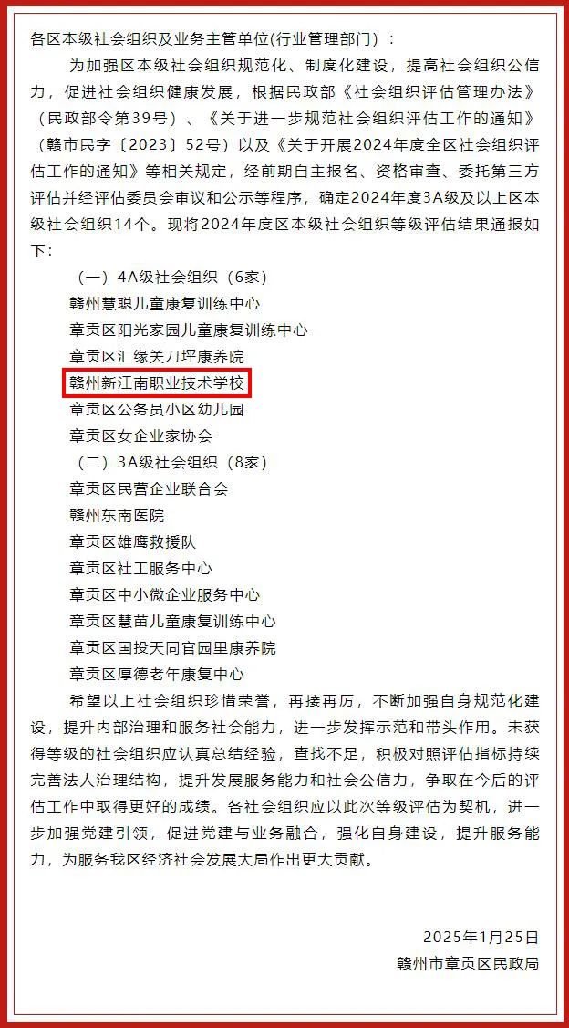 2025年1月25日,赣州市章贡区民政局发布2024年度区本级社会组织等级评估结果,经社会组织自评申报、资格审查、第三方评估并经评估委员会审议和公示等程序。赣州市章贡区社会组织评估委员会审核评定赣州新江南职业技术学校荣获4A级社会组织。